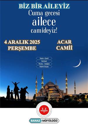 "Biz Bir Aileyiz Cuma Gecesi Ailece Camideyiz Projesi" kapsamında 04.12.2025 Perşembe günü Acar Cami'nde ikramlı "Yatsı Namazı Buluşması" yapıldı.