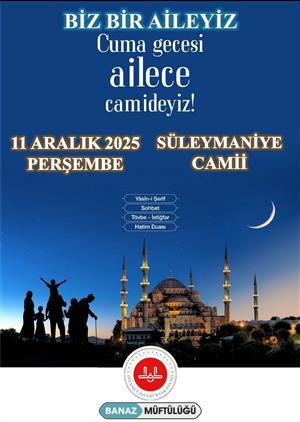 "Biz Bir Aileyiz Cuma Gecesi Ailece Camideyiz Projesi" kapsamında 11.12.2025 Perşembe günü Süleymaniye Cami'nde ikramlı "Yatsı Namazı Buluşması" yapıldı.