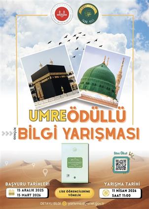 Diyanet İşleri Başkanlığınca, toplumun yapı taşını oluşturan gençlerin milli ve manevi değerler ekseninde yetişmelerine katkı sağlamak amacıyla pek çok alanda çalışmalar yürütüldüğü bilinmektedir. Gençliğin dini ve ahlaki değerlerini diri tutmak amacıyla 11 Nisan 2026 Cumartesi günü Üniversite ve Lise Öğrencileri arasında Ülke genelinde "Umre Ödüllü Gençlik Bilgi Yarışmaları" düzenlenecek olup ayrıntılı bilgi için linke tıklayınız!