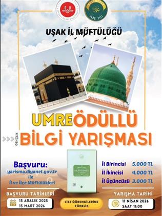Başkanlığımız tarafından Üniversite ve Lise Öğrencileri arası yapılacak olan Umre Ödüllü Bilgi Yarışmasının son başvuru tarihi 15 Mart 2026, sınav tarihi 11 Nisan 2026, yarışmaya başvuru linki https://yarisma.diyanet.gov.tr/ dir. Başkanlığımızın Türkiye geneli dereceye giren ilk 150 kişiyi Umre ödülünün yanı sıra Uşak İl genelinde dereceye girenlere de para ödülleri verilecektir.