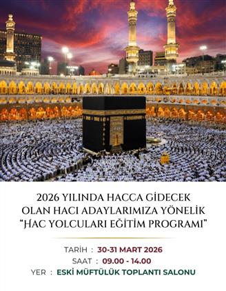 2026 yılında ilçemizden Hacca gidecek olan hacı adaylarımız için 31-31 Mart 2026 tarihlerinde 2 gün boyunca Eski Müftülük Toplantı Salonunda Hac Seminerleri yapılacak olup hacı adaylarımız davetlidir.