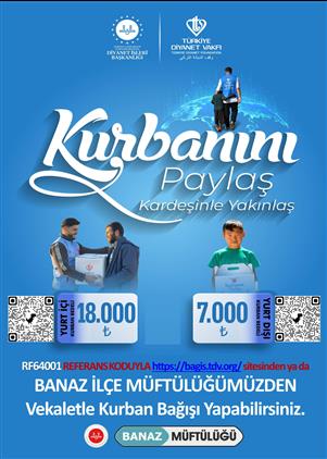 Kurbanlarını vekalet yoluyla kestirmek isteyen vatandaşlarımız için, Diyanet İşleri Başkanlığı ve Türkiye Diyanet Vakfı iş birliği ile önceki yıllarda olduğu gibi 2026 yılında da "Vekalet Yoluyla Kurban Kesim Organizasyonu" düzenlenmektedir. Yurt içinde olduğu gibi yurt dışında da 81 Ülke 398 Bölgede siz değerli cemaatimizin Kurban emanetlerini Dünyanın her yerine ulaştırıyoruz. 50 yıldır tüm insanlığın hizmetinde olan Türkiye Diyanet Vakfımız bu sene Yurt İçi Vekaletle Kurban Bedelini 18.000 TL, Yurt Dışı Vekaletle Kurban Bedelini 7.000 TL ve Filistin İçin Kurban Bedelini 15.000 TL olarak belirlemiştir. Vekaletle Kurban Bağışlarınız için, İlçe Müftülüğümüze müracaat edebilirsiniz.