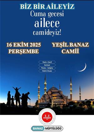 "Ailece Camideyiz Projesi" kapsamında 16.10.2025 Perşembe günü Yeşil Banaz Caminde ikramlı "Cuma Gecesi Yatsı Namazı Buluşması" yapıldı.